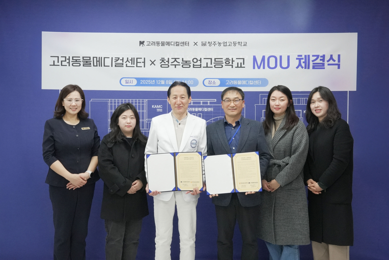 [충북일보] 이승근(왼쪽 세 번째) 고려동물메디컬센터 병원장과 채유기(오른쪽 세 번째) 청주농업고등학교 교감 등이 8일 고려동물메디컬센터에서 현장실습 기회 확대 등이 담긴 산학협력 활성화를 위한 업무협약을 하고 있다. 사진제공=청주농업고등학교