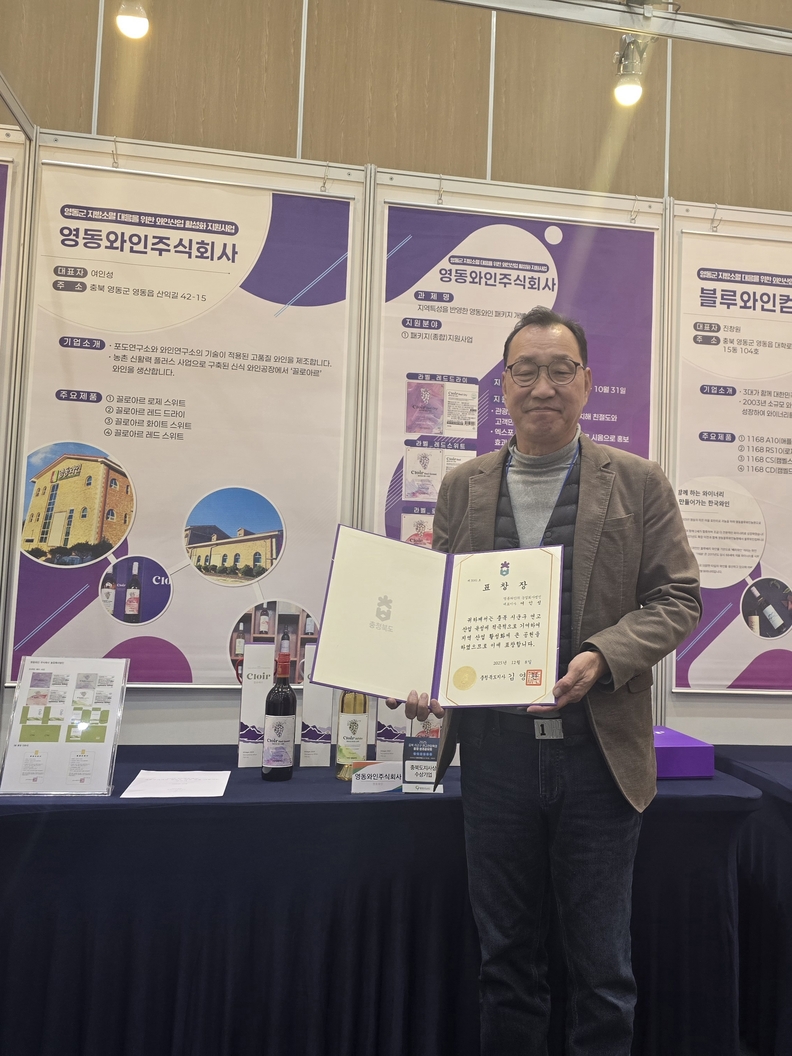 영동군을 대표하는 와인 제조기업 영동와인공장이 8일 오후 청주 오스코 전시장에서 열린‘2025 충북 시군구 연고산업육성 통합 성과공유회’에서 우수기업 표창을 수상했다. 사진은 여인성 대표.