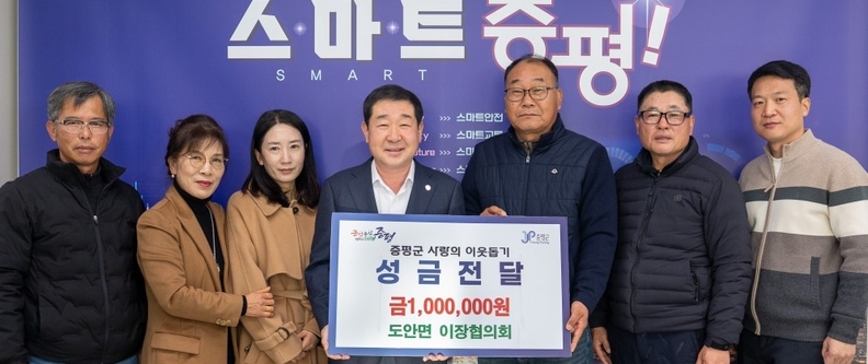 [충북일보] 연제흥(오른쪽 세 번째) 도안면 이장협의회장과 이장들이 9일 지역의 어려운 이웃을 위한 성금 100만 원을 이재영(가운데) 증평군수에게 기탁하고 있다.