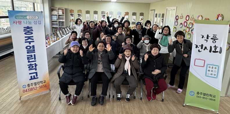충주열린학교 관계자들이 학습자 작품전시회를 연 뒤 단체사진을 찍고 있다.
