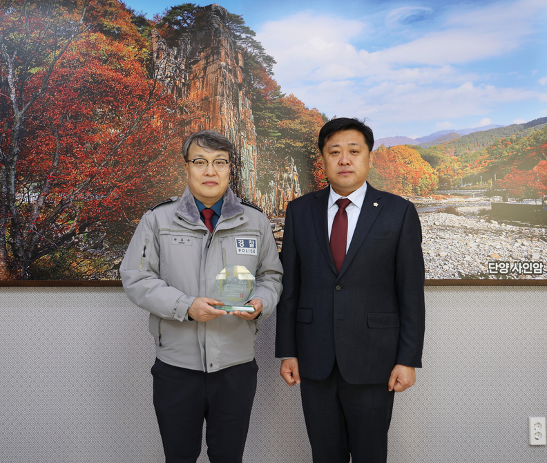 단양군의회로부터 치안 공로패를 받은 곽동주 단양경찰서장이 이상훈 의장과 기념촬영을 하고 있다.