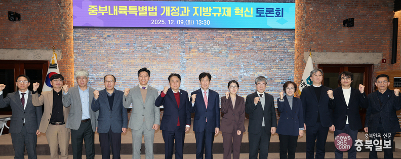 9일 충북도청 대회의실에서 열린 중부내륙특별법 개정과 지방규제 혁신 토론회에서 김영환 도지사와 토론자 등이 토론회에 앞서 기념촬영을 하고 있다. /