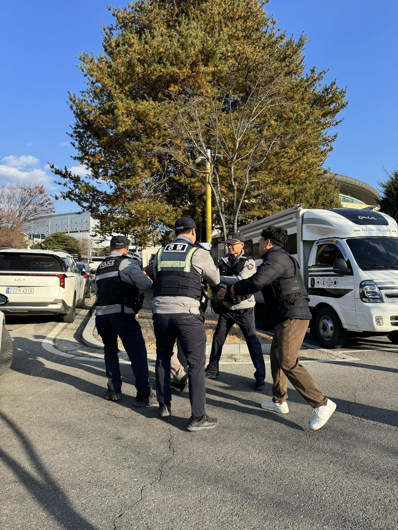 충주경찰서 직원이 스마트워치를 활용한 현장 맞춤형 안전조치 대응훈련을 하고 있다.