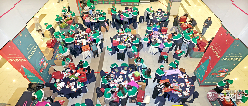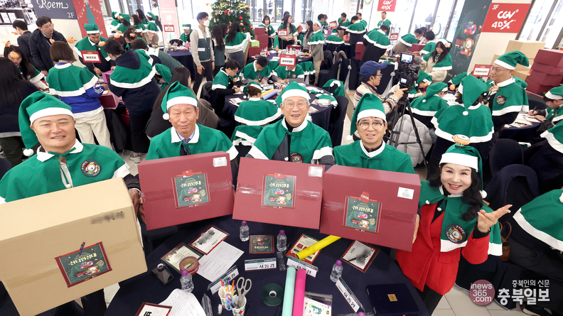 초록우산 어린이재단 충북후원회가 주최한 초록우산 산타원정대 선물포장 행사가 9일 청주시 흥덕구 지웰시티몰2 공개홀에서 후원기업과 단체, 자원봉사자 등이 참석해 열리고 있다. 이날 행사에서 참석자들이 선물 포장 작업을 하고 있다.