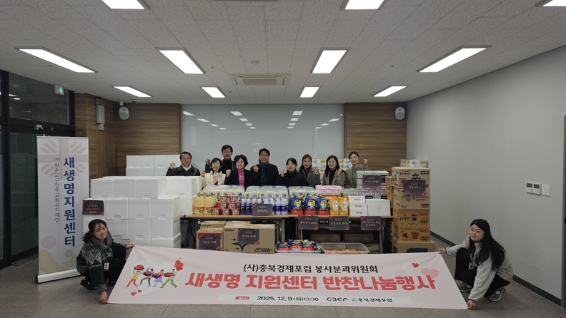 충북경제포럼 봉사분과위원회와 회원들이 새생명지원센터에서 '미혼모 돕기 반찬 및 생필품 나눔 행사'를 실시하고 있다.