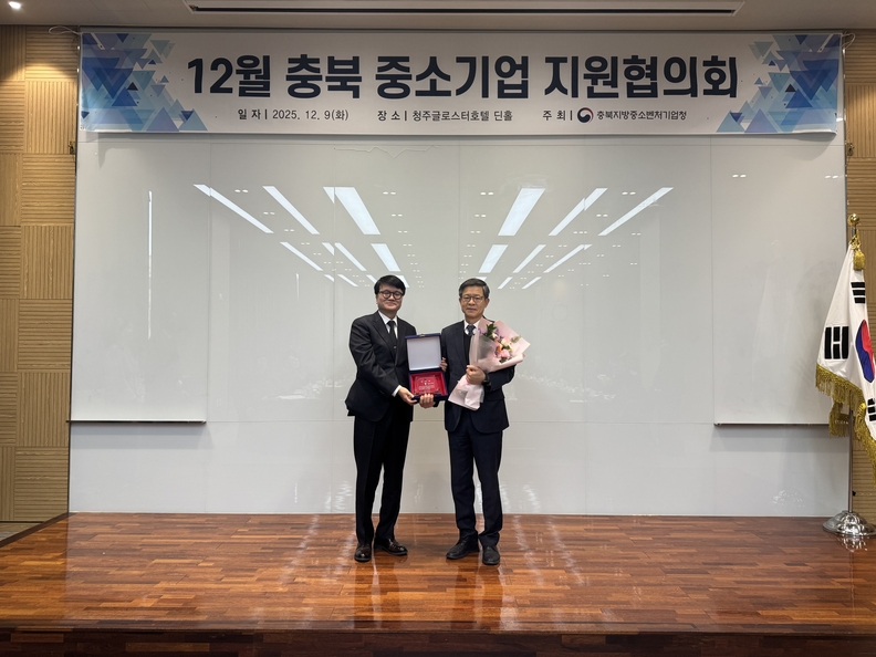 신형근(오른쪽) 충북기업진흥원장이 9일 '12월 충북 중소기업 지원협의회'에서 감사패를 받고 기념촬영하고 있다.