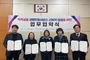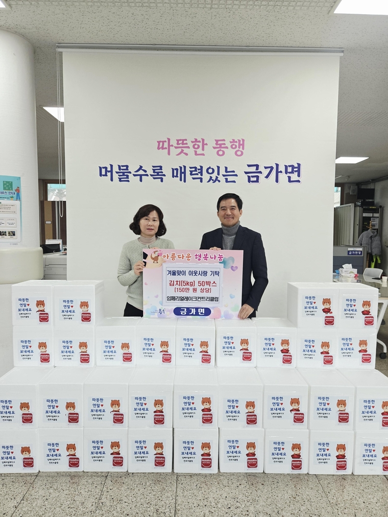금가면 임페리얼레이크 컨트리클럽 서향기(오른쪽) 대표가 경로당 등에 전달할 김치 상자 앞에서 기념사진을 찍고 있다.