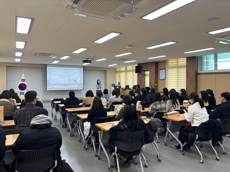 단양지역 내 교직원 40여 명이 친절교육 서비스 전문가 김민주 강사의 '친절한 민원 응대 및 특이민원 대응' 교육을 받고 있다.