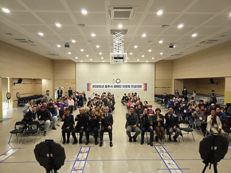 충주시 장애인 어울림 한궁대회 참석자들이 단체사진을 찍고 있다.