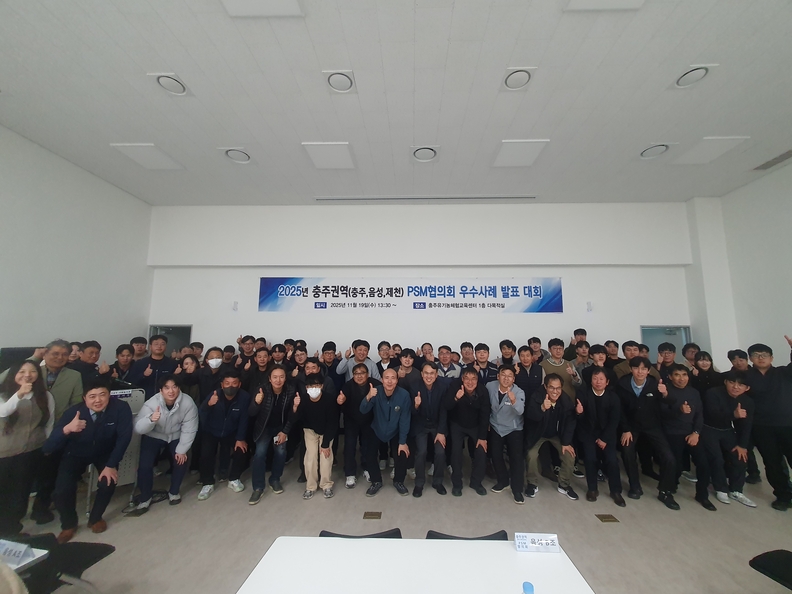 충북권공정안전협의회 워크숍 참석자들이 단체사진을 찍고 있다.