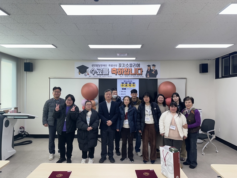성인발달장애인들이 교통대에서 마련한 꽃차소믈리에 수료식에 참여하며 단체사진을 찍고 있다.