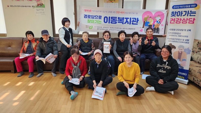 청주시 탑대성동 행정복지센터가 지난 10일 LH탑동아파트 경로당에서 '찾아가는 이동복지관 사업'을 진행하며 기념촬영을 하고 있다.