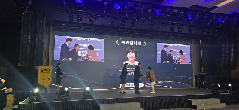충청북도의회 산업경제위원장인 김꽃임 의원이 2025 초정대상 시상식에서 소상공인연합회 중앙회로부터 '목민 감사패'를 받고 있다.