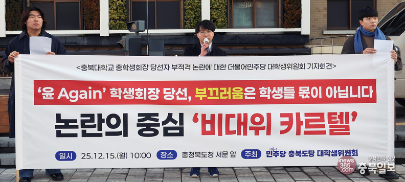 15일 오전 충북도청 서문 앞에서 더불어민주당 충북도당 대학생위원회가 충북대학교 총학생회장 당선자 부적격 논란에 대한 기자회견을 하고 있다.