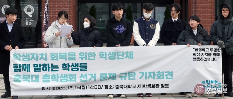 충북대학교 학생자치 회복을 위한 학생단체인 ‘함께 말하는 학생’들이 15일 오후 청주시 개신동 충북대학교 1학생회관 앞에서 최근 논란이 되고 있는 총학생회장 선거문제 규탄 기자회견을 하고 있다.