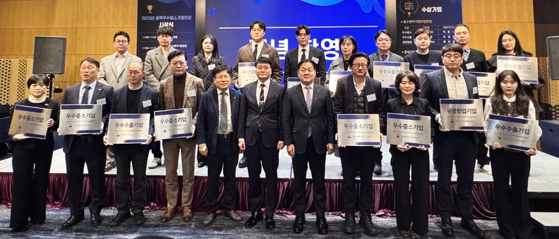 '2025년 충북우수중소기업인 시상식' 수상자들이 기념촬영하고 있다.