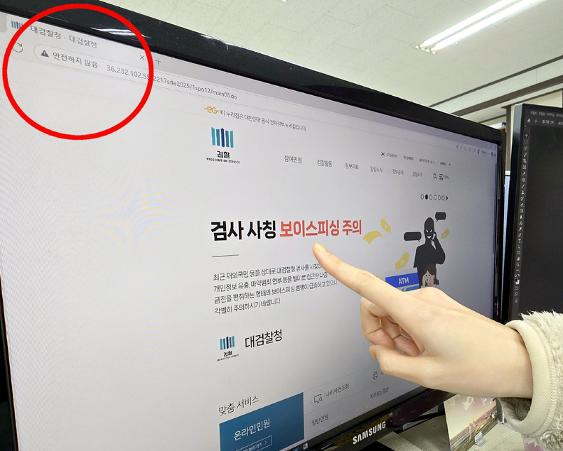 충북의 한 사무실에서 보이스피싱범의 전화를 받은 시민이 피싱범이 알려준 누리집 화면을 띄우고 살펴보고 있다. 대검찰청 누리집을 사칭한 이 누리집은 진본과 달리 '안전하지 않음' 경고가 떠 있다.