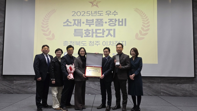 충북도가 16일 산업통상부 주관으로 열린 2025 소부장 특화단지 성과 공유회에서 우수단지로 선정된 후 도청 직원들이 기념촬영을 하고 있다.
