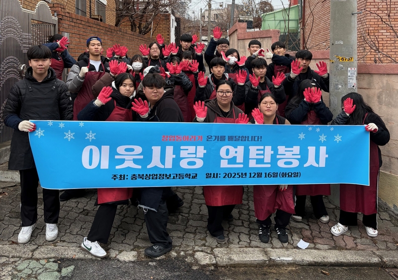 충북상업정보고 창업동아리 학생들이 연탄나눔을 실천하고 기념촬영하고 있다.