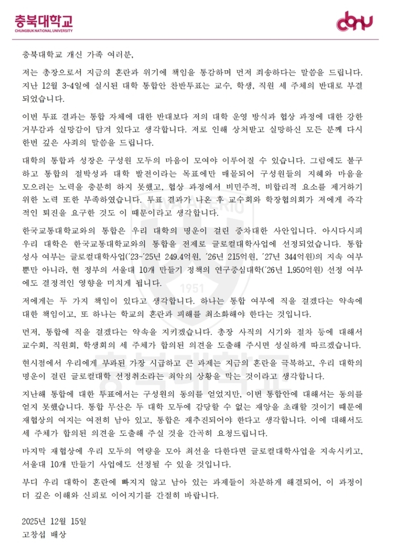 고창섭 총장이 지난 15일 충북대 구성원들에게 밝힌 서한문