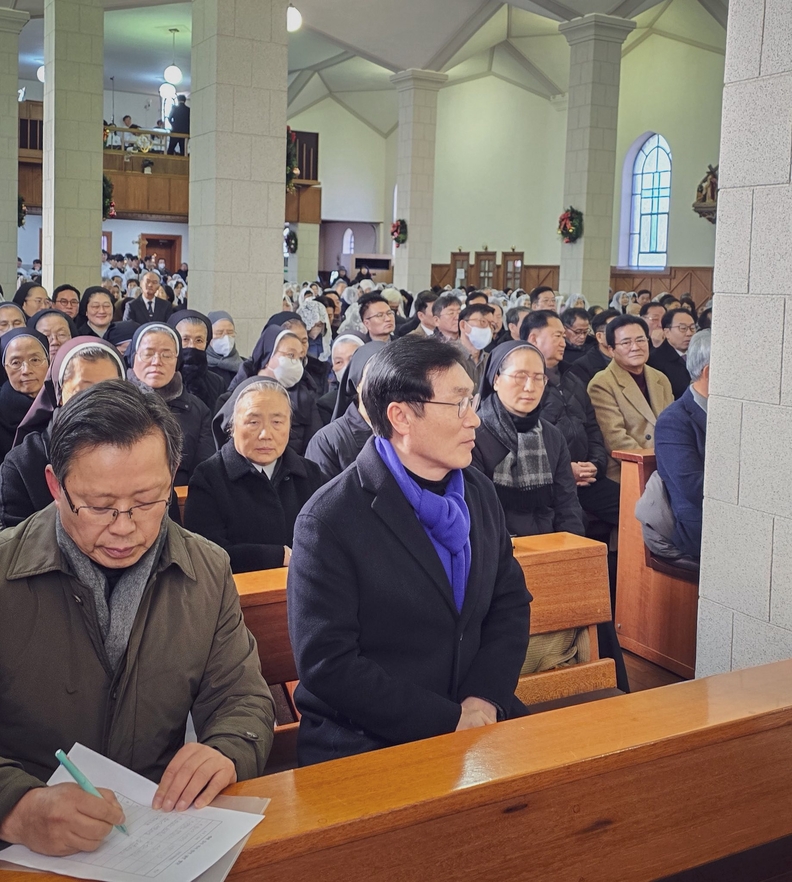 이장섭 전 국회의원이 청주시 내덕동 주교좌성당에서 열린 새해 감사 미사에 참여하고 있다.