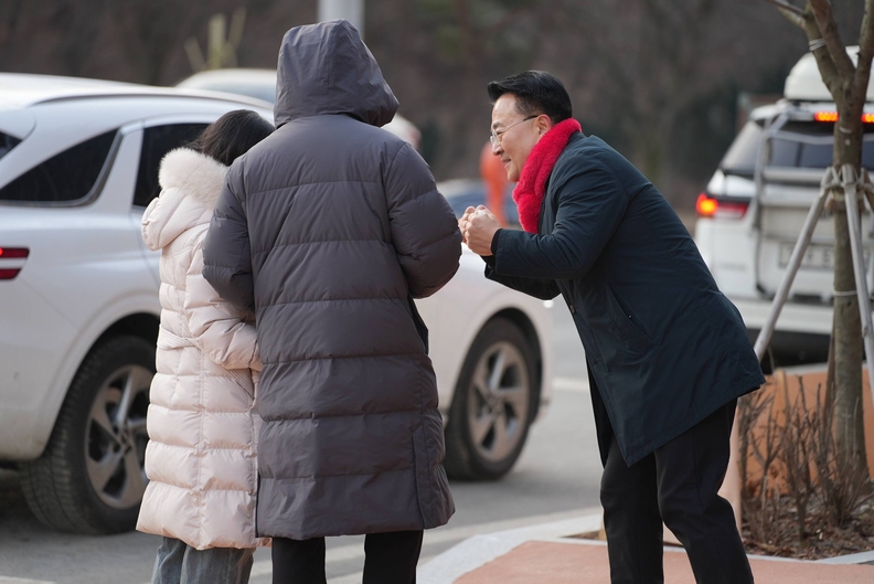 서승우 국민의힘 청주시 상당당협위원장이 새해 첫날 시민들과 만나 인사하고 있다.