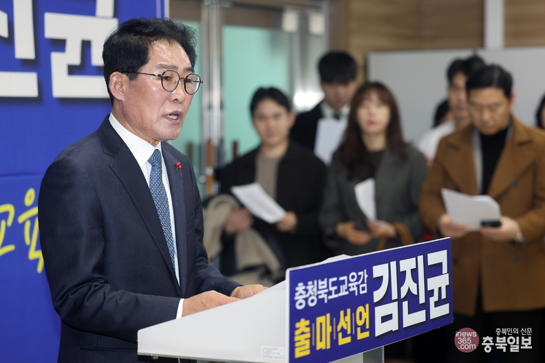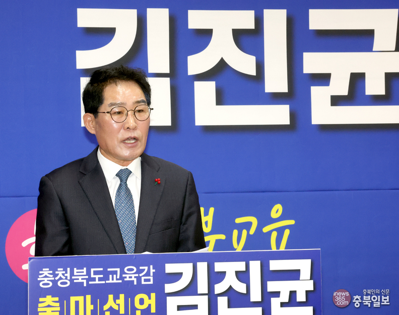 김진균 청주시체육회장이 7일 충북도교육청 기자실에서 기자회견을 열고 오는 6월 3일 치러지는 19대 충북교육감 선거 출마 선언을 하고 있다.