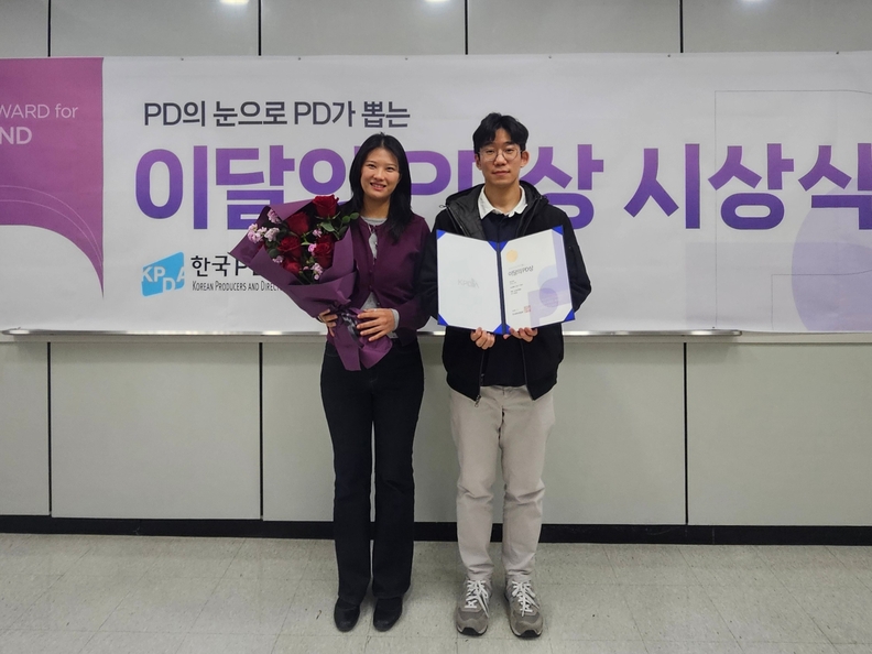한국PD연합회 309회 라디오 지역 부문 이달의 PD상을 수상한 한국도로교통공단 tbn충북교통방송 최예은(사진 왼쪽)·강성용PD가 기념촬영을 하고 있다.