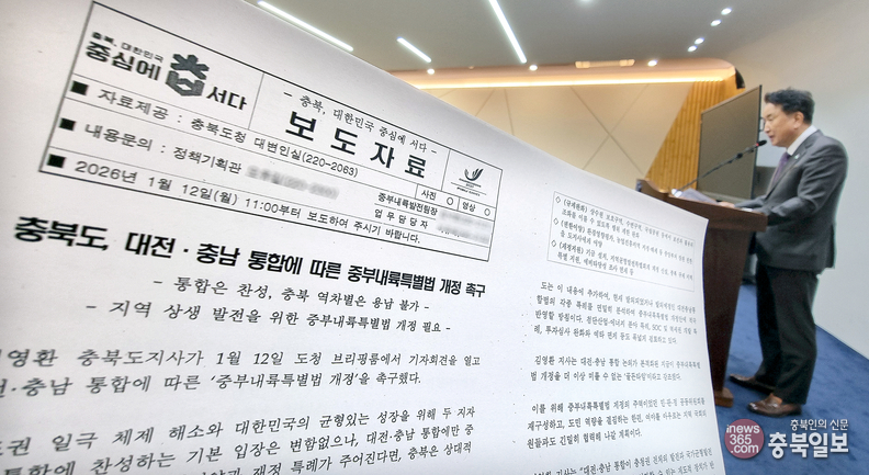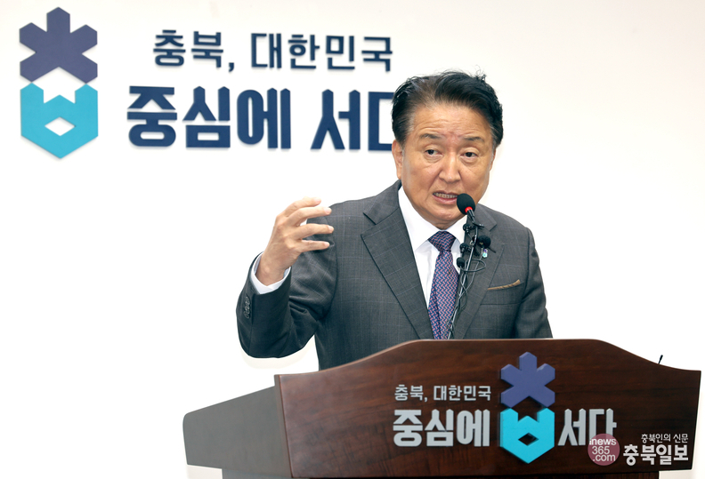 김영환 충북도지사가 12일 도청 브리핑룸에서 기자회견을 열고 대전·충남 행정통합 추진에 따른 제도 변화에 대응하기 위해 중부내륙특별법 개정의 필요성을 강조하고 있다.