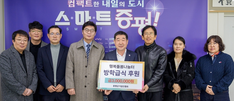 백선근(왼쪽 세번 째) 증평군기업인협회장과 임원진이 14일 증평군청을 방문해 겨울방학 아동급식비 후원금 300만 원을 이재영(오른쪽 네 번째) 군수에게 전달하고 있다.