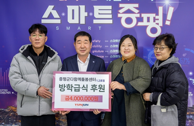 김태수(왼쪽) (주)윤준에스티 대표가 14일 증평군청을 찾아 겨울방학 아동급식비 후원금 400만 원을 이재영(왼쪽 두 번째) 군수에게 전달하고 있다.