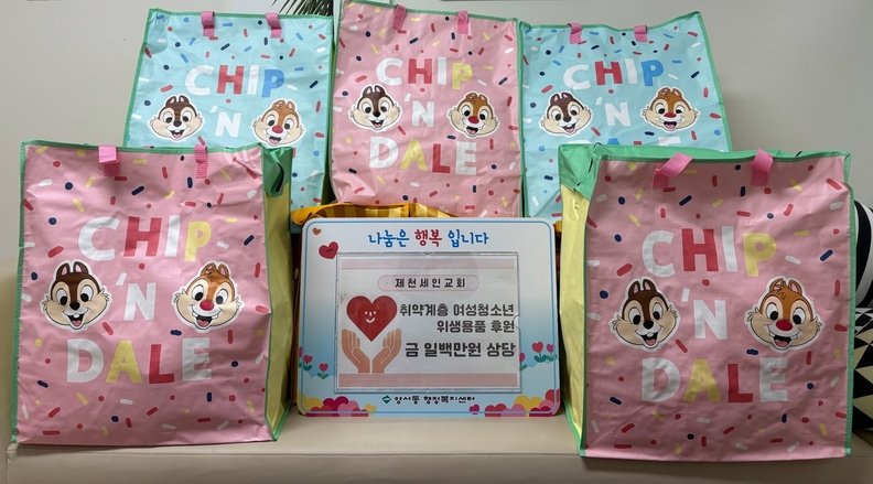 제천세인교회가 지역 내 저소득 가구 여성 청소년들을 위해 기부한 100만 원 상당의 위생용품 꾸러미.