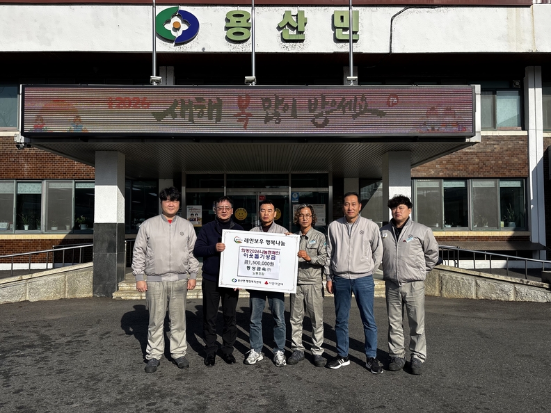 동성금속 노동조합 관계자들이 14일 용산면사무소를 찾아 조합원들이 자발적으로 모은 성금 150만 원을 기탁한 뒤 기념촬영을 하고 있다.