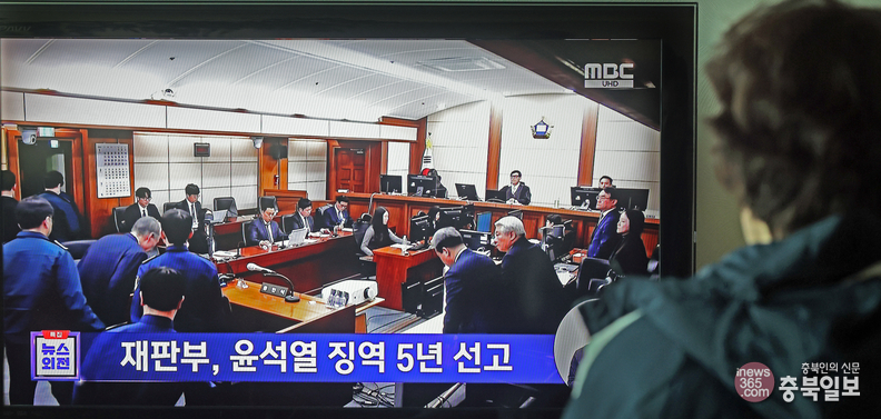 [충북일보]16일 서울중앙지방법원에서 12·3 비상계엄 선포 과정과 관련해 열린 윤석열 전 대통령의 1심 선고 공판에서 재판부가 징역 5년을 선고한 가운데, 한 시민이 TV로 생중계된 재판을 지켜보고 있다. / 김용수기자