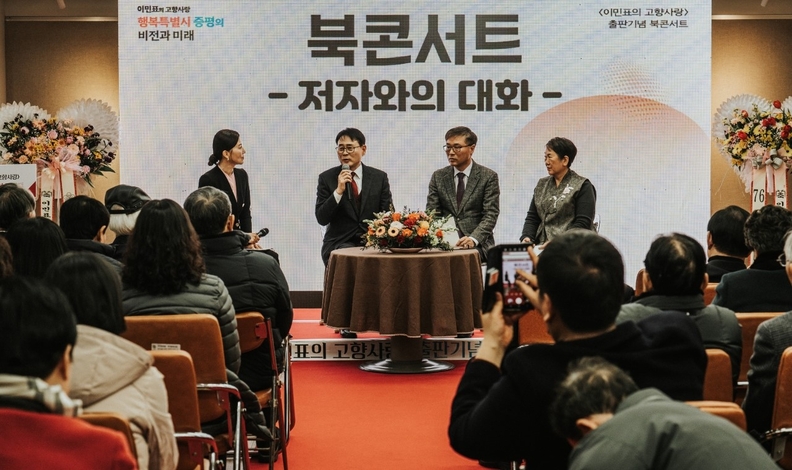 이민표(맨앞 왼쪽 두 번째) 증평살림연구소장이 지난 17일 증평문화원 갤러리에서 저서 ‘이민표의 증평사랑’ 출판기념 북콘서트를 진행하고 있다.