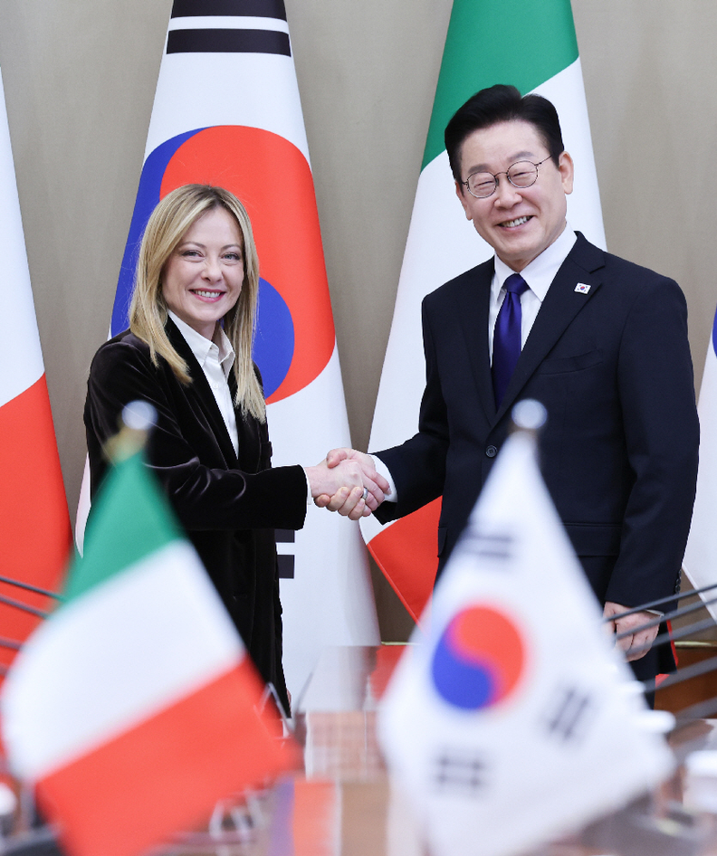 이재명 대통령과 조르자 멜로니 이탈리아 총리가 19일 청와대에서 열린 확대회담에서 악수하고 있다.
