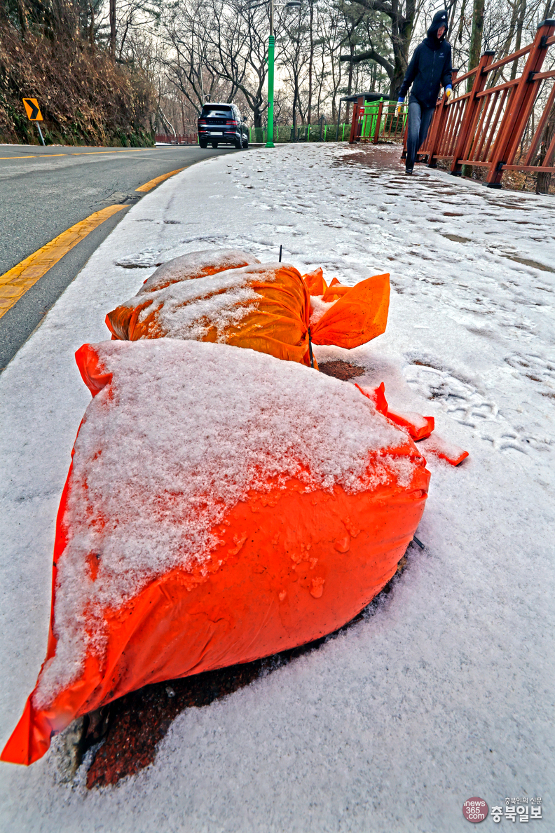 절기상 대한(大寒)을 하루 앞둔 19일, 밤새 내린 눈이 쌓인 청주 우암산순환도로 산책로 곳곳에 제설용 모래가 놓여 있다. 기상청은 20일부터 올겨울 들어 가장 길고 강력한 한파가 찾아올 것으로 예보해 시민들의 빙판길 안전운전과 한랭 질환 대비가 요구된다. /