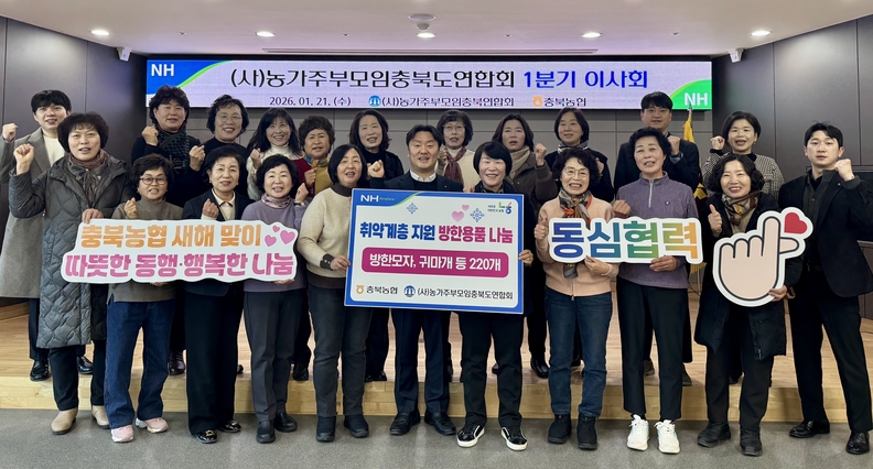 (앞줄 오른쪽에서 다섯 번째부터) 이상경 회장, 한상민 농협중앙회 충북본부 부본부장과 농주모 시군 회장, 충북농협 직원들이 올해 첫 이사회를 열고 기념촬영하고 있다.