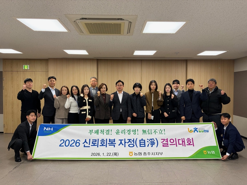 농협 충주시지부 관계자들이 윤리경영을 위한 결의대회를 연 뒤 단체사진을 찍고 있다.