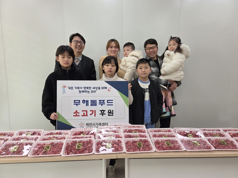 제천 '무해돌푸드' 가족이 지역 내 취약 가족 자녀들을 위한 국내산 소고기 국거리용 50팩을 정기 후원하고 있다.