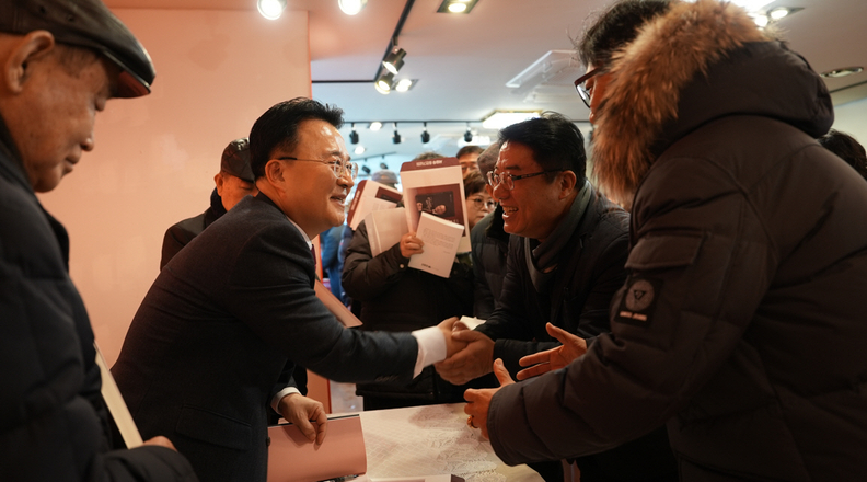 서승우(왼쪽) 전 충북도 행정부지사가 자신의 출판기념회 행사를 찾아준 이들과 악수를 나누고 있다.