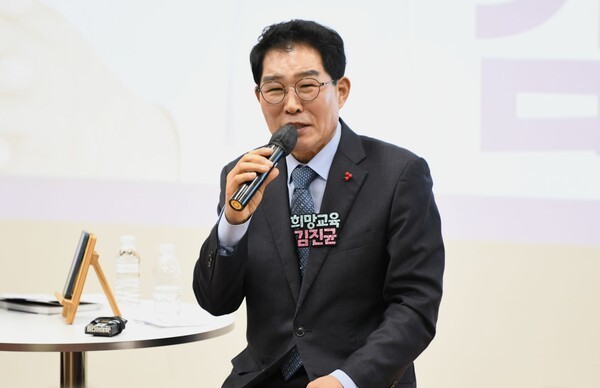 김진균 청주시체육회장이 지난달 31일 오후 충북대학교 법학대학원 대강의실에서 '함께 희망 충북교육' 출간을 기념한 북콘서트를 열고 있다.