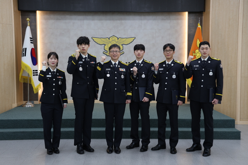 단양소방서 신규 임용자와 근속 승진자들이 엄재웅 서장과 함께 화이팅하고 있다.