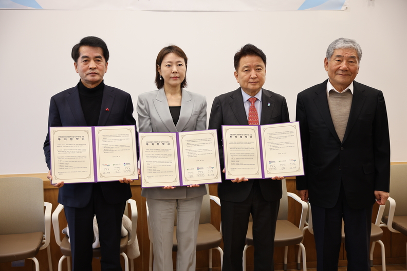 보은군 구병산관광지 관광숙박시설 조성 투자협약식에서 최재형 보은군수(왼쪽부터), 문유선 라미드관광(주) 대표이사, 김영환 충북도지사, 문병욱 라미드 호텔&리조트 회장이 협약서를 들고 기념촬영을 하고 있다.
