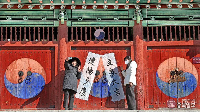 [충북일보] 절기상 봄의 시작을 알리는 입춘(立春)을 하루 앞둔 3일, 청주시 상당구 청주향교 외삼문에 '입춘대길(立春大吉)', '건양다경(建陽多慶)'이라고 적힌 입춘첩이 부착돼 있다. 시민들이 입춘첩을 배경으로 기념사진을 찍으며 다가오는 봄의 맞이하고 있다. / 김용수기자