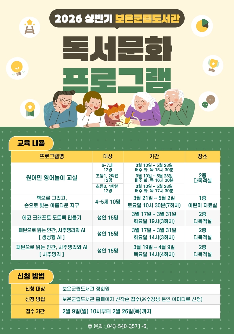 보은군립도서관 독서문화 프로그램 포스터. 유아부터 성인까지 참여할 수 있는 원어민 영어놀이교실, 생성형 AI 강좌 등 7개 프로그램이 마련돼 2월 9일부터 선착순 접수가 진행된다.