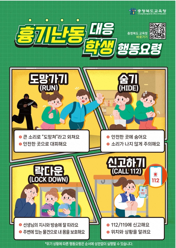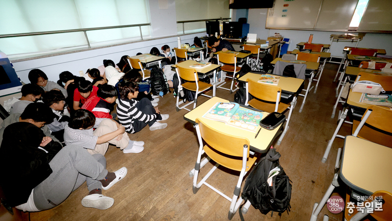 교육부가 충북도교육청이 자체 마련한 흉기 난동 대응 매뉴얼 등 돌발 위기상황 대응체계를 전국 학교에 적용하는 방안을 검토하고 있다. 사진은 지난해 10월 청주의 한 초등학교에서 진행된 위기대응 모의훈련 모습.