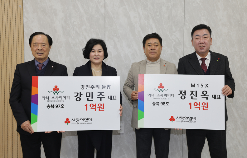 강민주(왼쪽 두번째) 강민주의 들밥 대표와 정진옥(오른쪽 두번째) M15X 대표가 충북 아너 소사이어티에 가입하고 기념촬영을 하고 있다.(