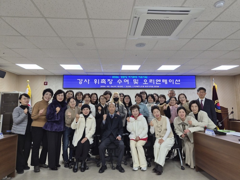 대한노인회 충주시지회 회의실에서 경로당 여가문화 강사 위촉식이 열린 뒤 참석자들이 단체사진을 찍고 있다.