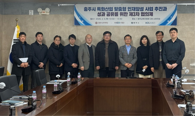 교통대 RISE사업단에서 마련한 충주시 특화산업 맞춤형 인재양성 제3차 협의체 참석자들이 단체사진을 찍고 있다.